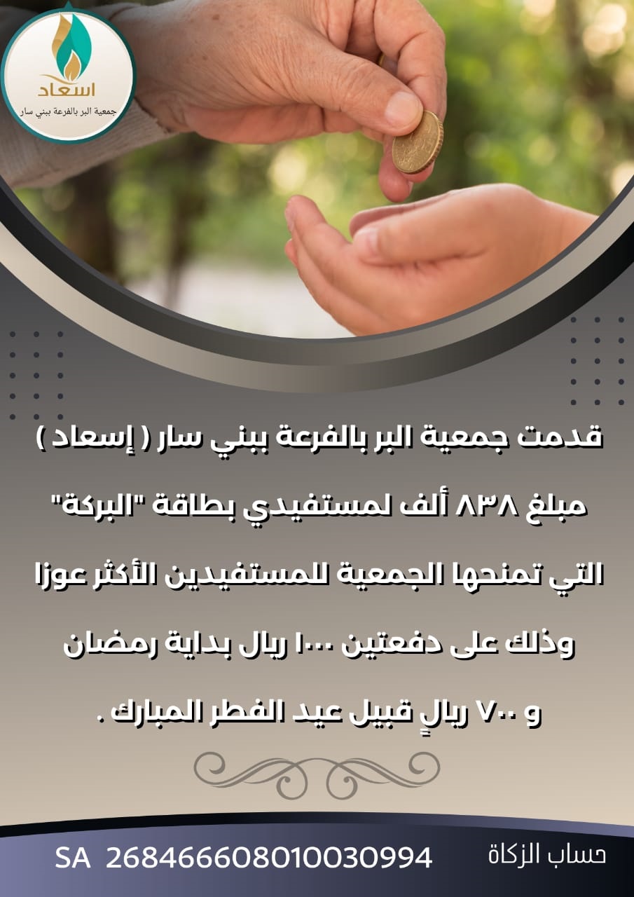 قدمت جمعية البر الخيرية بالفرعة ببني سار ( إسعاد ) أكثر من 800 ألف ريال لمستفيدي بطاقة البركة التي تمنحها الجمعية للأسر الأكثر عوزاً خلال شهر رمضان المبارك لهذا العام حيث بلغ مجموع ما قدم لكل مستفيد 1700 ريال ونسأل الله أن يبارك لكل من ساهم في هذا المشروع وكل عام وأنتم بخير